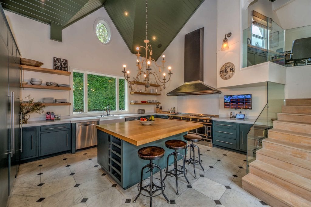 La cocina es industrial, aunque también algo rural, con toques clásicos. Los colores del techo y de los muebles aportan personalidad con ese color aguamarina. Destacar la isla central donde se reunirá toda la familia en la hora del desayuno.