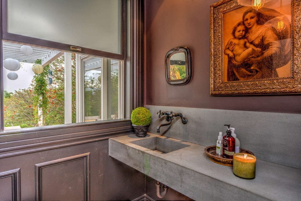 El baño de la casa de Elsa Pataky está decorado con microcemento, un material de moda que aporta un efecto minimalista, casi desnudo. Quizá si copias algo, mejor ahorrarte el cuadro, que en este caso le da una nota muy clásica al lugar.
